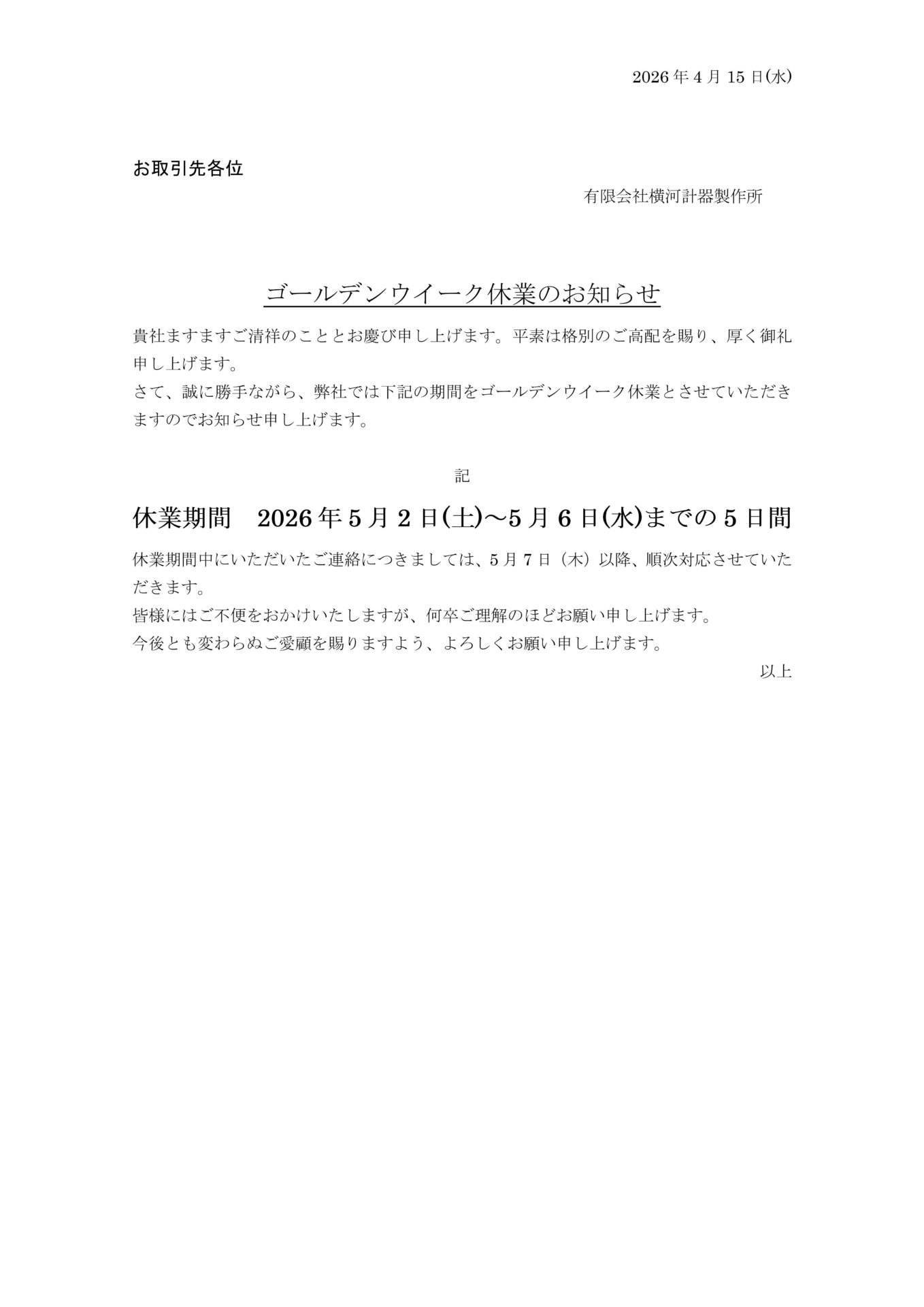 弊社のゴールデンウィーク休業日をお知らせします。 5月2日(土)~5月6日(水) ご迷惑をお掛け致しますが、何卒よろしくお願い申し上げます。 最近のお知らせ 棚卸・年末年始休業について2025年12月8日お知らせ 夏季休業のお知らせ2025年7月29日お知らせ 中間棚卸のお知らせ2025年6月23日お知らせ